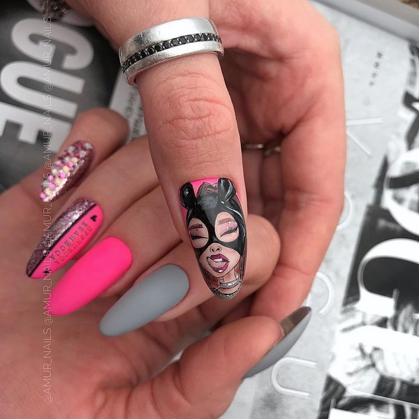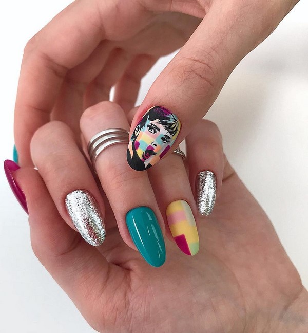 Vous voulez un design de clou unique et extraordinaire? Dans ce cas, vous devriez probablement privilégier plus qu’un design spectaculaire d’ongles pop art, en le complétant par des brillants. Les couleurs vives et les imprimés inhabituels constitueront la principale caractéristique de ce design nail art. Mais les étincelles ajouteront de la sophistication à la manucure pop art.