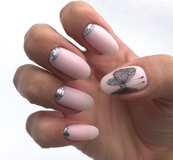 Les maîtres créatifs de la conception d'ongles artistiques offrent des nouveautés exquises de la manucure lunaire, dans lesquelles la lunula peut être décorée d'étincelles de différentes variations. La technique de la conception des ongles par la lune suggère de réaliser une manucure douce avec des étincelles et des papillons ou des fleurs. La principale tendance de la manucure lunaire avec paillettes sera une finition mate en monochrome ou en différentes nuances.